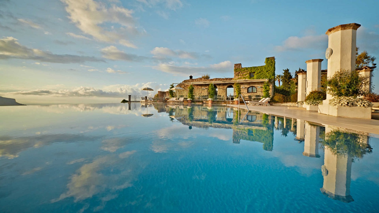 - The property’s truly jaw-dropping infinity swimming pool is often listed among the best hotel pools in the world. Built in 2005 on the domain’s highest point, the pool is an architectural triumph which appears to be suspended over the Amalfi coastline, taking full advantage of the phenomenal vistas. The pool is adequately sized and lined with very comfortable white-cushioned sun loungers and umbrellas. Clay pots filled with pink and white flowers decorate the stone-tile deck. Pool services include the concierge delivering an iPod pre-loaded with your choice of music, or a fresh fruit appetizer or cocktail to the side of the pool as you swim.